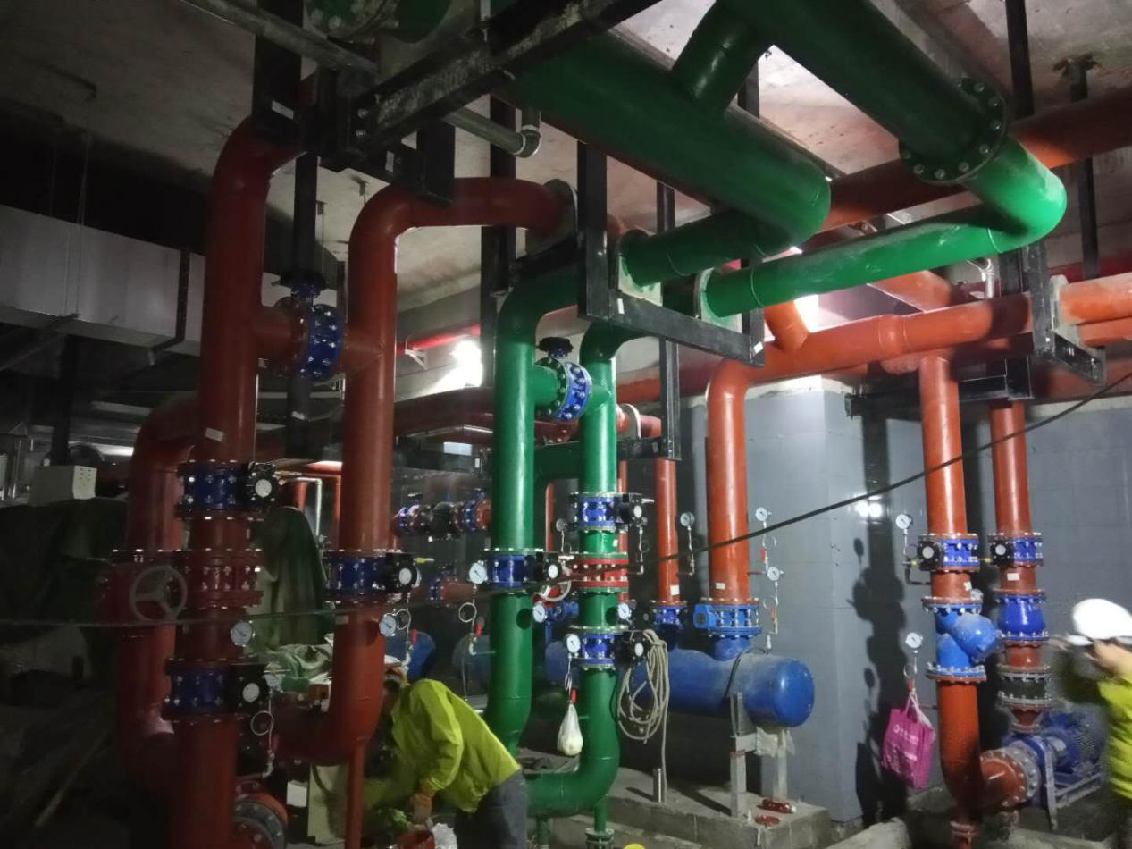 本项目位于四川省成都市元华路与蒋店路交叉路口,本站主体建筑面积为12587平方米,车站全长338米,其中冷水机房位于地下一层,面积为210平方米,机房内设计8台设备,2台冷水机组,2台冷却水泵,2台冷冻水泵,2台管道式全程水处理器,管道工程量270米,最大管径为DN250,管道材质分别为无缝钢管和镀锌钢管组成。