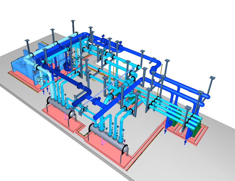 主要设备:螺杆式冷水机组2台(额定制冷量728kw/台)、循环水泵4台(Q=138m³/h,H=32m,N=18.5kw两台;Q=165m³/h,H=30m,N=22kw两台)综合水处理器2台、分集水器各1台,预制加工管道(DN125~DN250)总长300米。