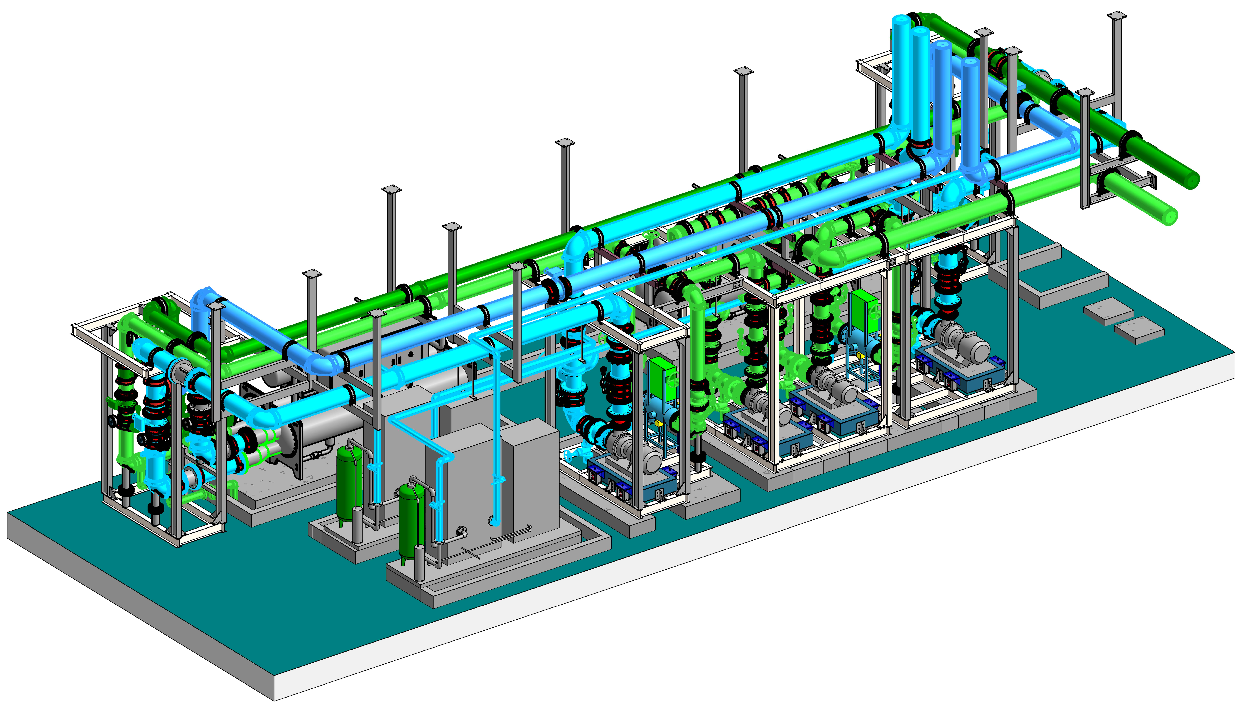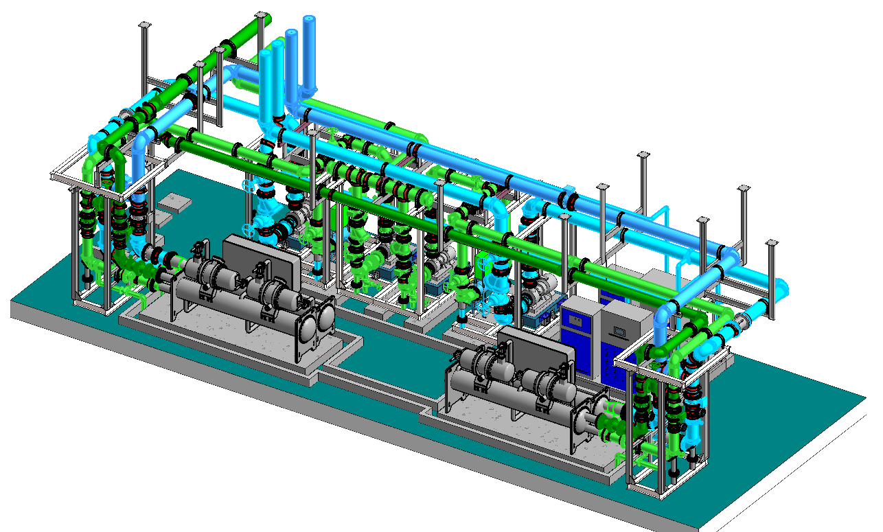 主要设备:螺杆式冷水机组2台,冷却水泵2台(Q=160m³/h,H=32m,N=22kw),冷冻水泵2台(Q=115m³/h,H=34m,N=15kw),全程综合水处理器2台,AOP水处理两台,加药装置2台。制冷机房最大水管管径DN200,最小管径为DN40,主要管材为热镀锌无缝钢管,管道大约230米。