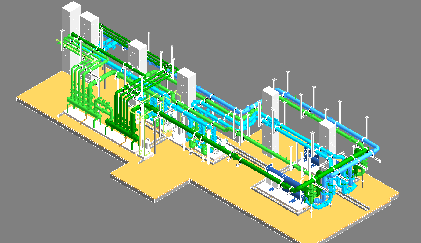 主要设备:螺杆式冷水机组2台(额定制冷量635kw/台)、冷冻循环泵2台(Q=120m³/h,N=18.5kw)、冷却循环泵2台(Q=145m³/h,N=18.5kw)、旁流水处理器2台(N=0.6kw)、分集水器各1台、预制加工管道(DN100~DN300)总长342余米。