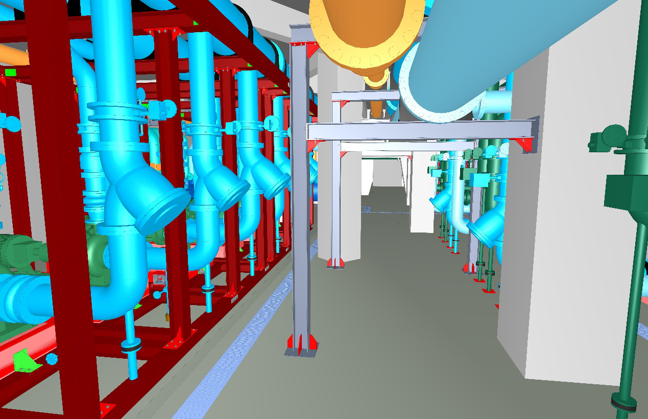 主要设备:离心式冷水机组4台(额定制冷量4572kw/台),离心式冷水机组1台(额定制冷量2638kw/台)、循环泵16台(Q=1024m³/h,H=28m,N=110kw六台;Q=863m³/h,H=37m,N=132kw六台;Q=398m³/h,H=29m,N=45kw四台)、分集水器各1台、预制加工管道(DN150~DN700)总长950米。