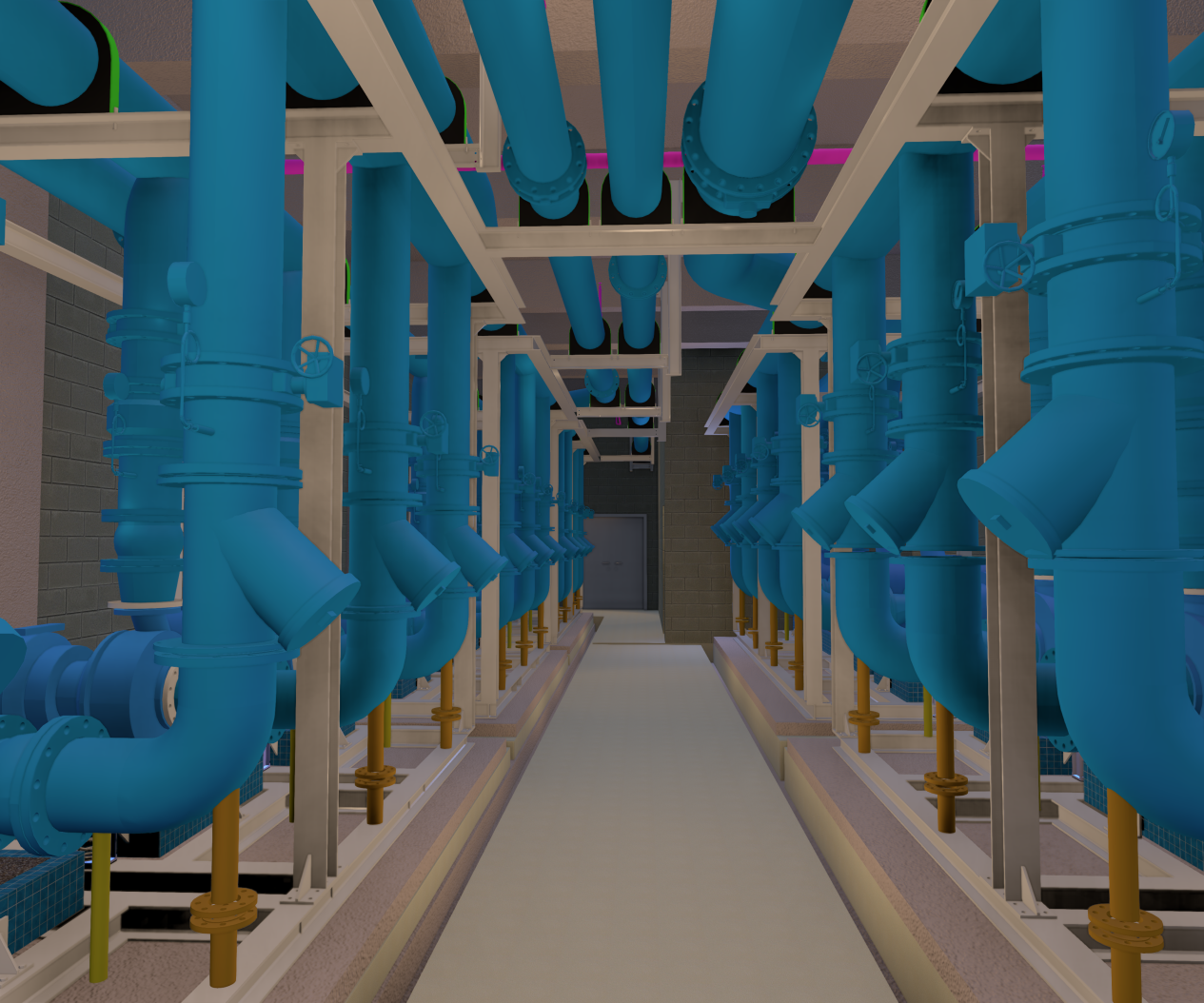 项目特点难点:制冷机房净高空间5米,管道管径均为DN700、DN800、DN900,冷水机组进出口高,阀门大,整体排布难度较大,最终确定排布方案为机组区主管道为高标高,水泵模块区为低标高。二次泵房空间狭小且水泵较多,整体排布局限性较大。最终采用水泵模块成排排布,整体美观。