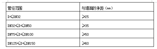 8.水管与墙(或柱)的间距,见下表: