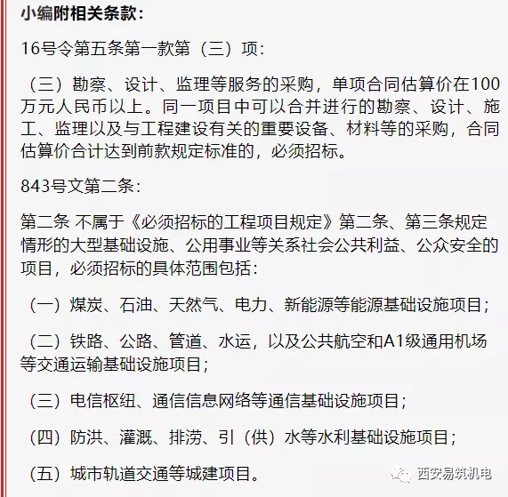 2.关于项目与单项采购的关系。16号令第二条至第四条及843号文第二条规定范围的项目,其勘察、设计、施工、监理以及与工程建设有关的重要设备、材料等的单项采购分别达到16号令第五条规定的相应单项合同价估算标准的,该单项采购必须招标;该项目中未达到前述相应标准的单项采购,不属于16号令规定的必须招标范畴。