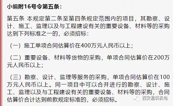 4.关于同一项目中的合并采购。16号令第五条规定的“同一项目中可以合并进行的勘察、设计、施工、监理以及与工程建设有关的重要设备、材料等的采购,合同估算价合计达到前款规定标准的,必须招标”,目的是防止发包方通过化整为零方式规避招标。其中“同一项目中可以合并进行”,是指根据项目实际,以及行业标准或行业惯例,符合科学性、经济性、可操作性要求,同一项目中适宜放在一起进行采购的同类采购项目。