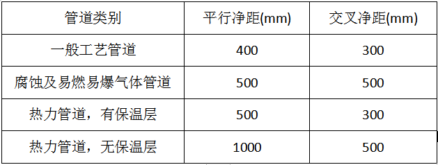 4、电缆桥架与管道之间最小间隙满足下表要求。