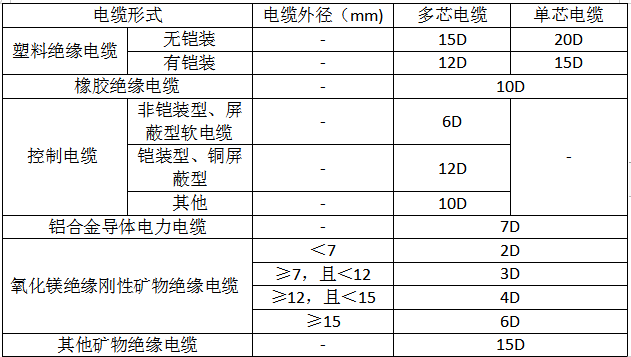 7、电缆梯架、托盘和槽盒转弯、分支处宜采用专用连接配件,其弯曲半径不应小于梯架、托盘和槽盒内电缆最小允许弯曲半径,电缆最小允许弯曲半径应符合下表规定。