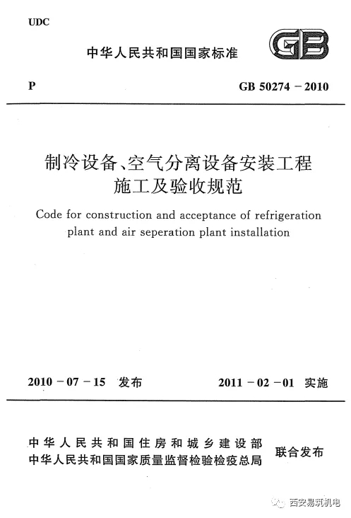 4.GB 50274—2010《制冷设备、空气分离设备安装工程施工及验收规范》(中华人民共和 国机械工业部主编,中华人民共和国建设部批准,
